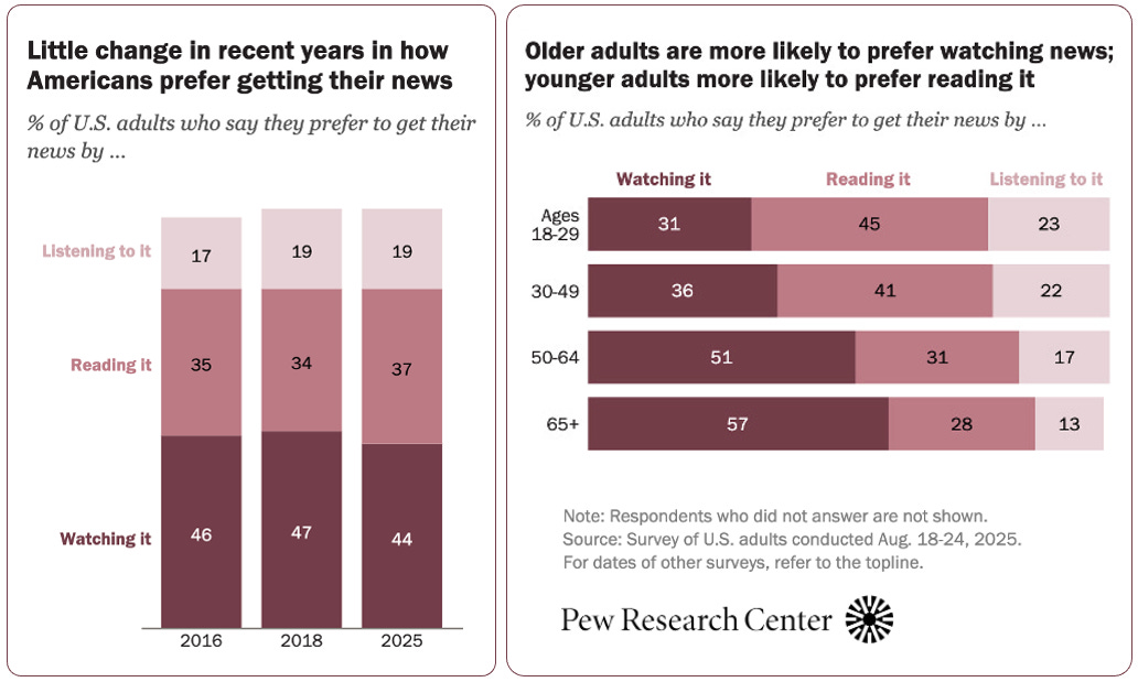 Según un estudio recién publicado del think tank estadounidense Pew Research Center, el 44% de los ciudadanos en aquel país prefiere ver las noticias para informarse, un 37% apuesta por leerlas y el 19% restante prefiere escucharlas como primera opción. Estos porcentajes son muy parecidos a los de 2018, la última vez en que se planteó esta pregunta a los encuestados. Entonces, el 47% dijo que prefería verlas, el 34% leerlas y el 19% escucharlas. Si se analizan las respuestas por grupos de edad, la lectura es la opción preferida por los jóvenes de 18 a 29 años y por el grupo de 30 a 49 años, según queda reflejado en los gráficos. El periodista y consultor Ismael Nafría aporta más detalles en la edición nº 141 de Tendenci@s, newsletter quincenal sobre medios y contenidos digitales, recursos y oportunidades, The New York Times y el mundo de las newsletters.