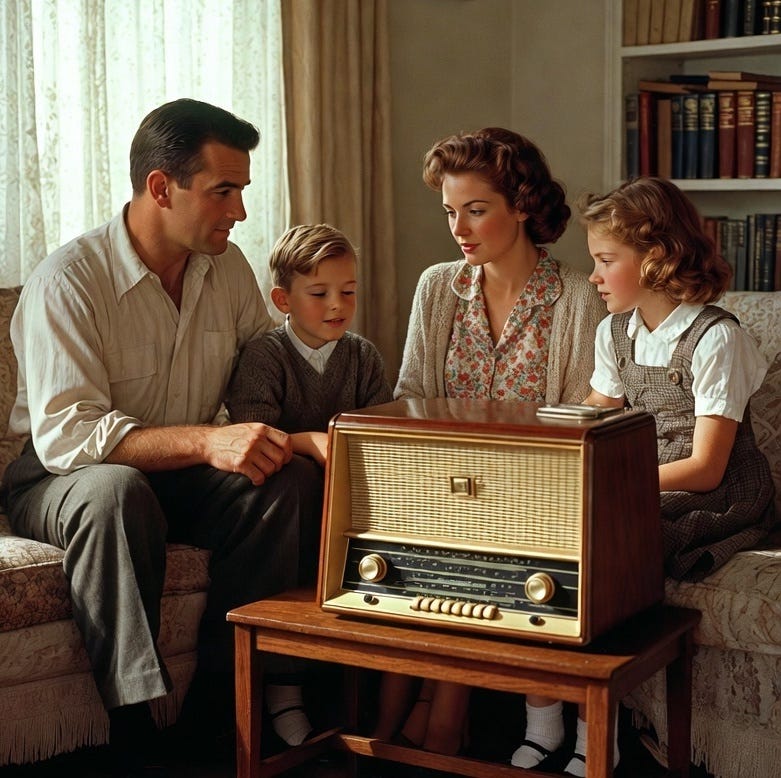 Mr. Audio se descubrió a sí mismo joven, confiado, imprescindible. Habitaba el centro del hogar, presidía el salón, marcaba los ritmos de la jornada. La radio hablaba al oído y, al mismo tiempo, a la comunidad: informaba, entretenía, educaba, emocionaba… Era compañía y era ritual. Bastaban una voz bien dicha, una música precisa y un oportuno silencio para convocar y fascinar a poblaciones enteras.